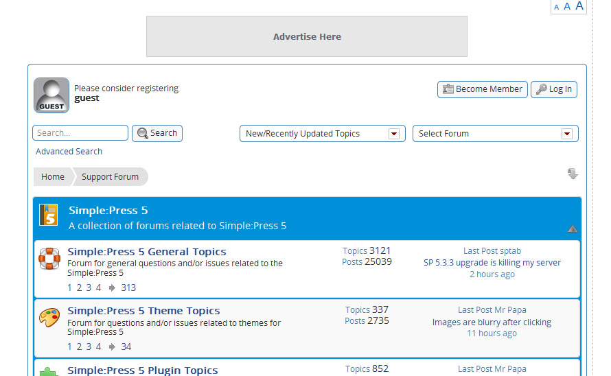 Bienvenido a la casa de Simple: Press – el número uno plugin de foro que se integra perfectamente en su sitio web WordPress. Ya sea que necesite un pequeño foro privado o un gran espacio público, Simple: Press escalará a las necesidades de su comunidad y ofrece las características que normalmente sólo están disponibles en una aplicación de foro independiente.