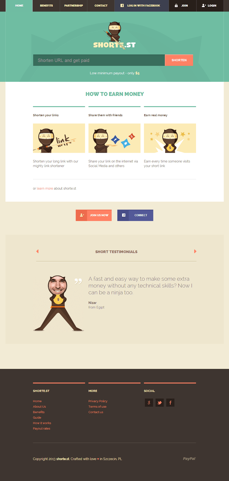 La nueva adquisición dentro de mi repertorio de acortadores monetizadoses Shorte.st. Una web creada desde Polonia con un diseño mas que aceptable. Es mas… se sale de lo normal por lo «ninja» que está hecho.